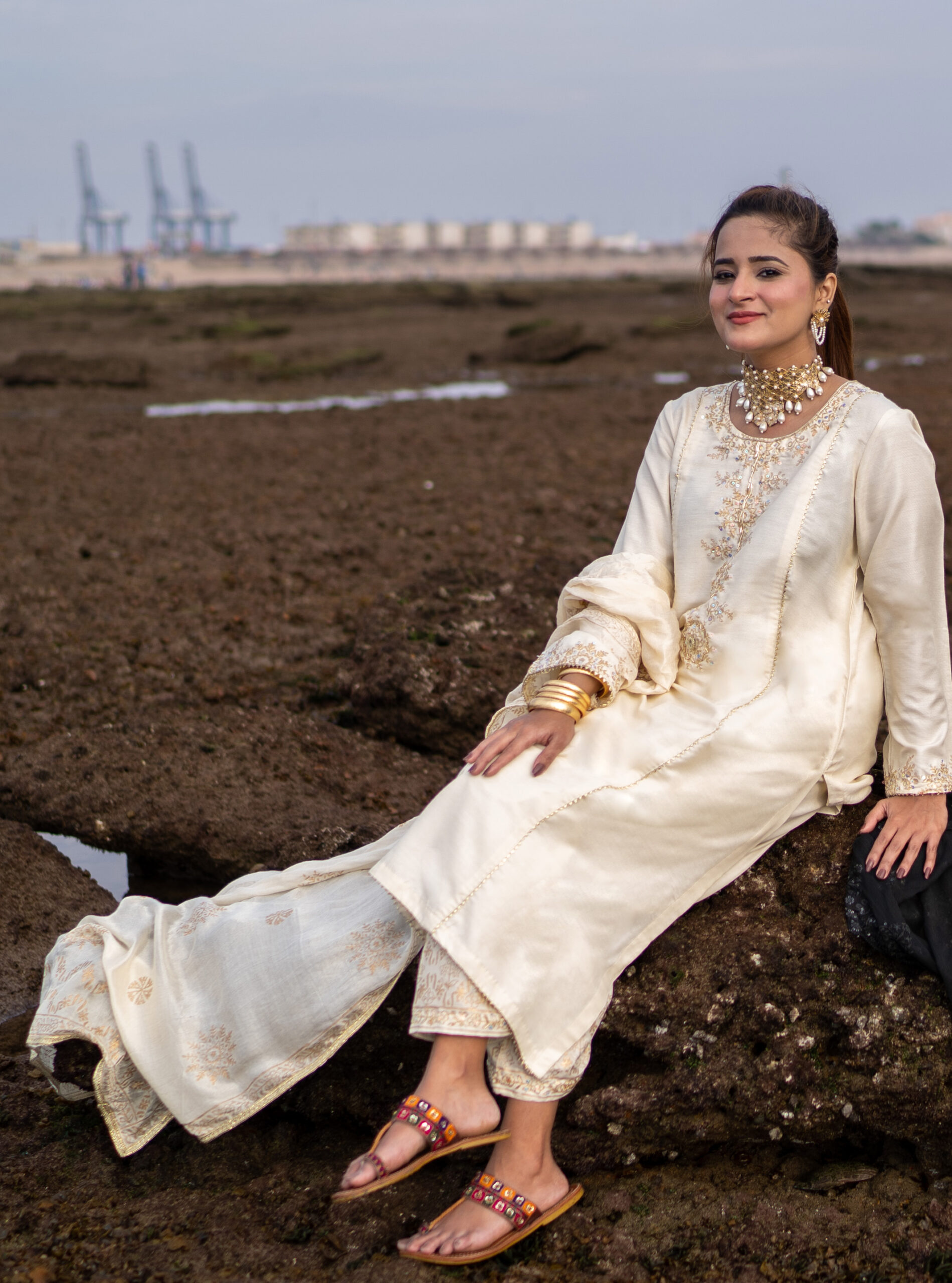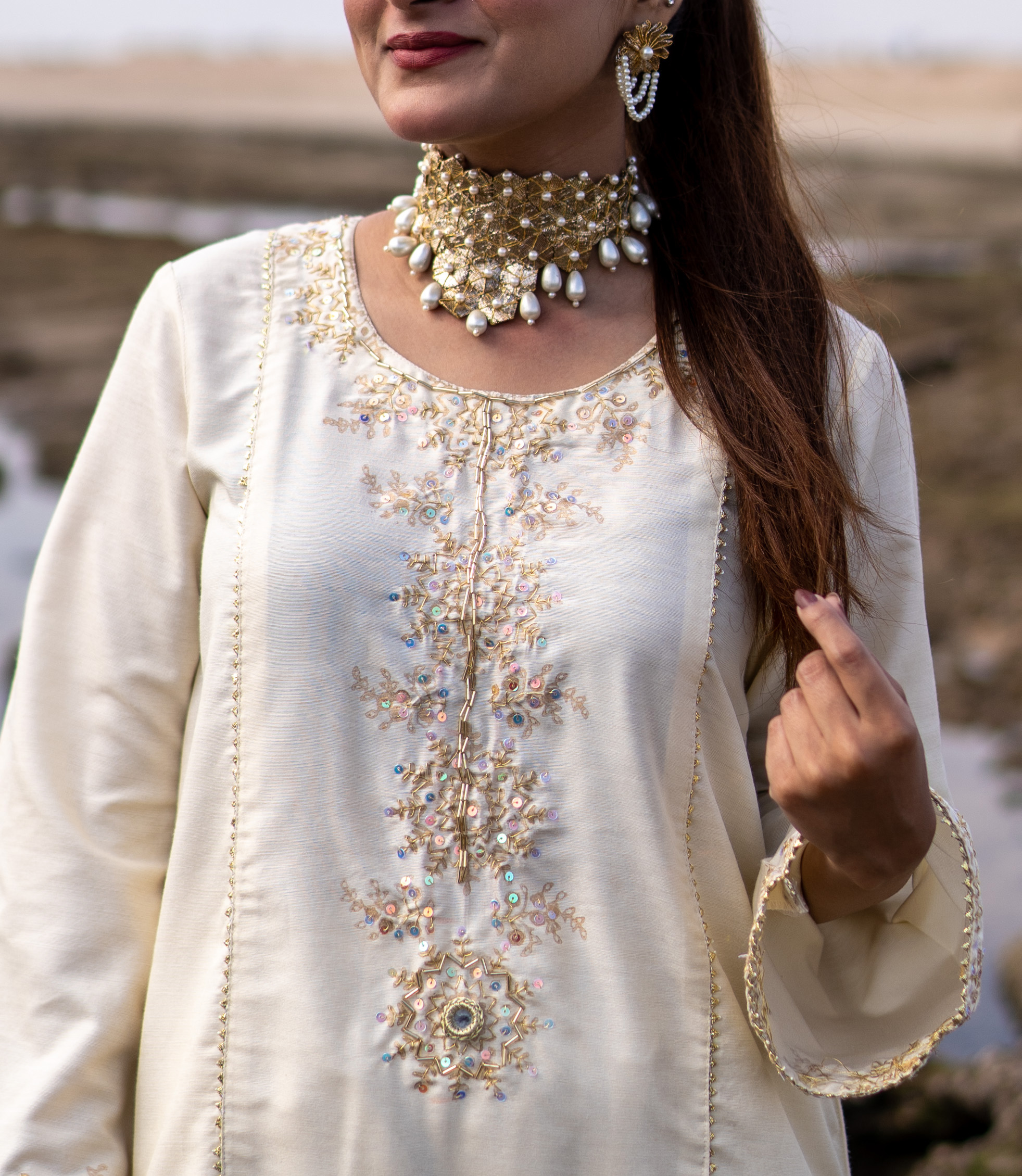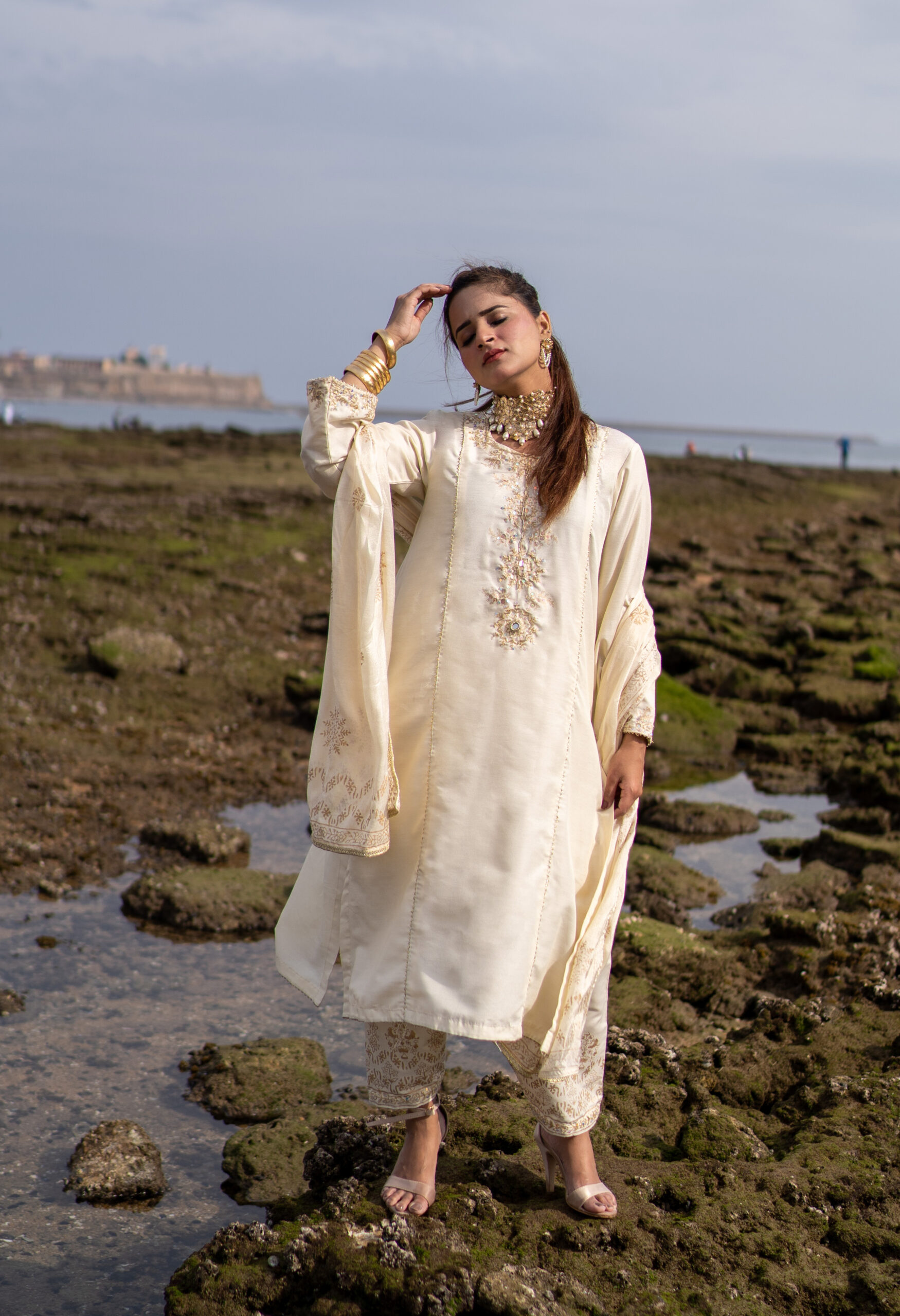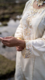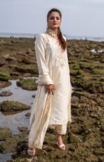Elegance meets sophistication in Chhod Do Anchal. This graceful off-white ensemble features a long shirt with gold block print and hand embellishments, paired with a matching shalwar and anchal. Crafted in khadi cotton, it’s a timeless design that blends subtle charm with effortless grace.