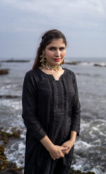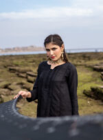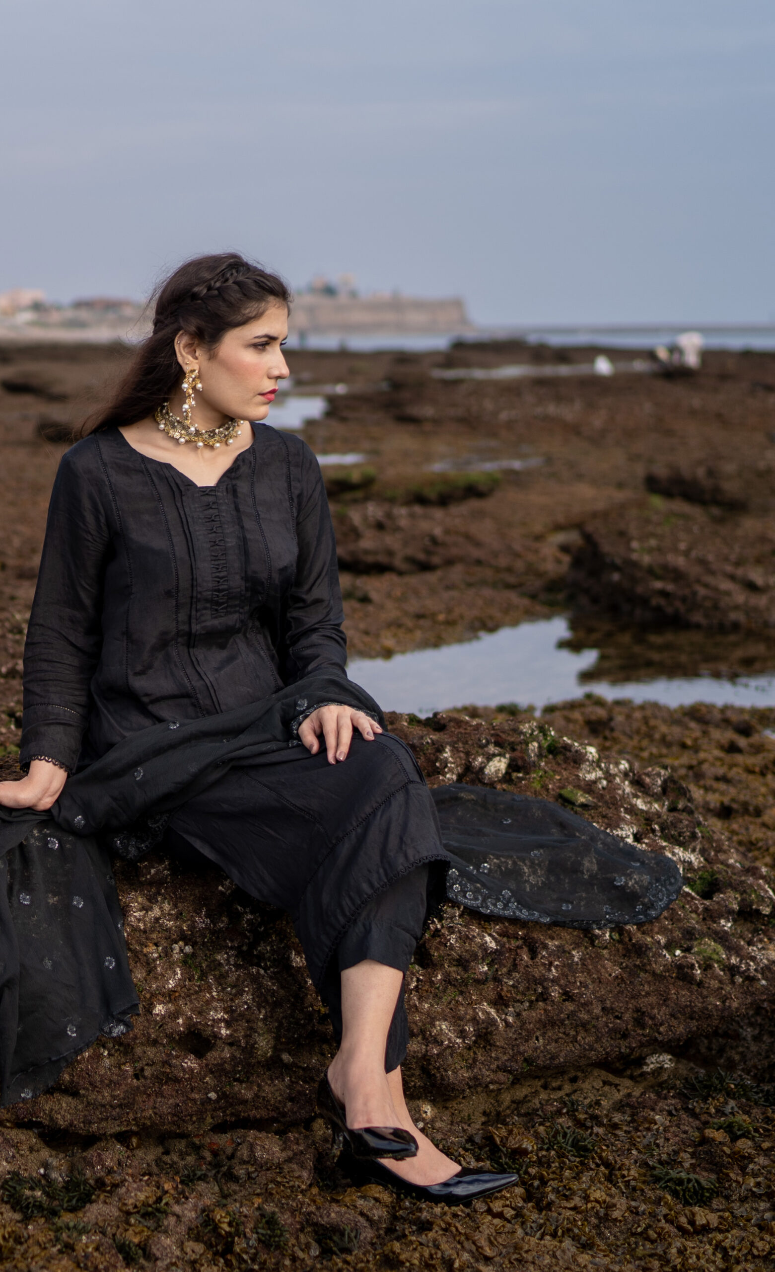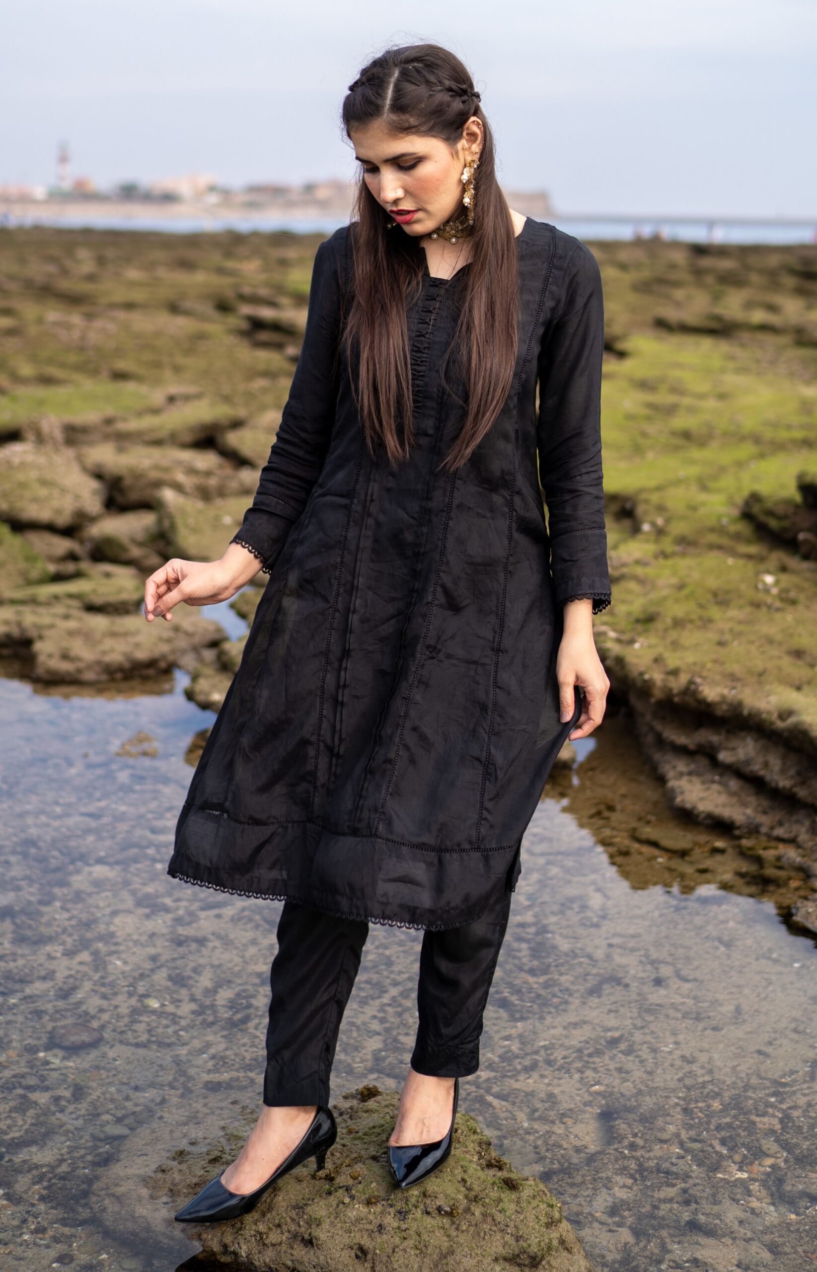 Dekha Ek Khwaab is designed to turn heads. Crafted in classic black cotton silk, this ensemble features a long shirt adorned with intricate laces and pleats, paired with matching bottoms. A timeless design that radiates elegance and sophistication.