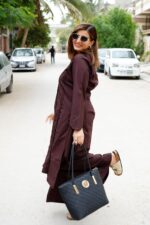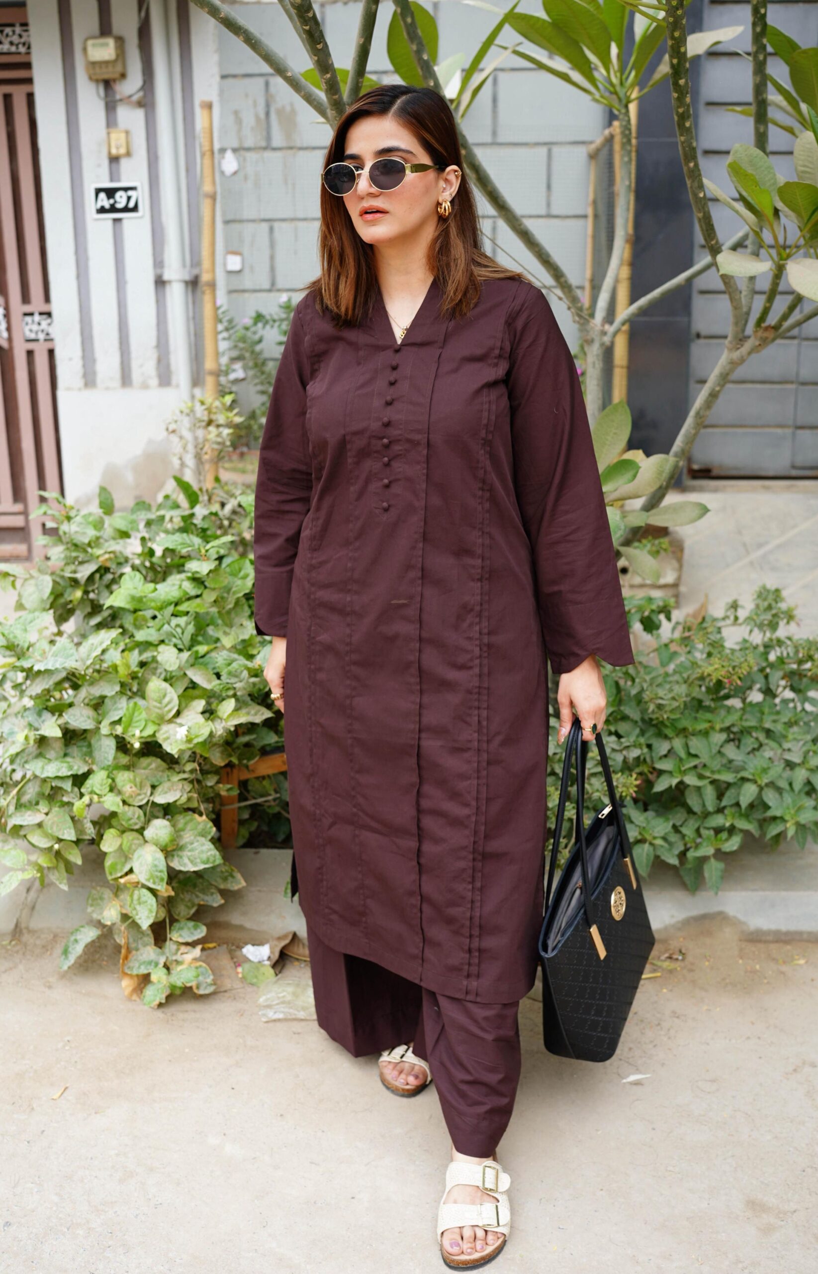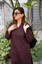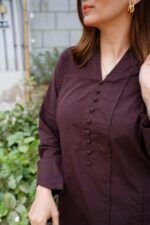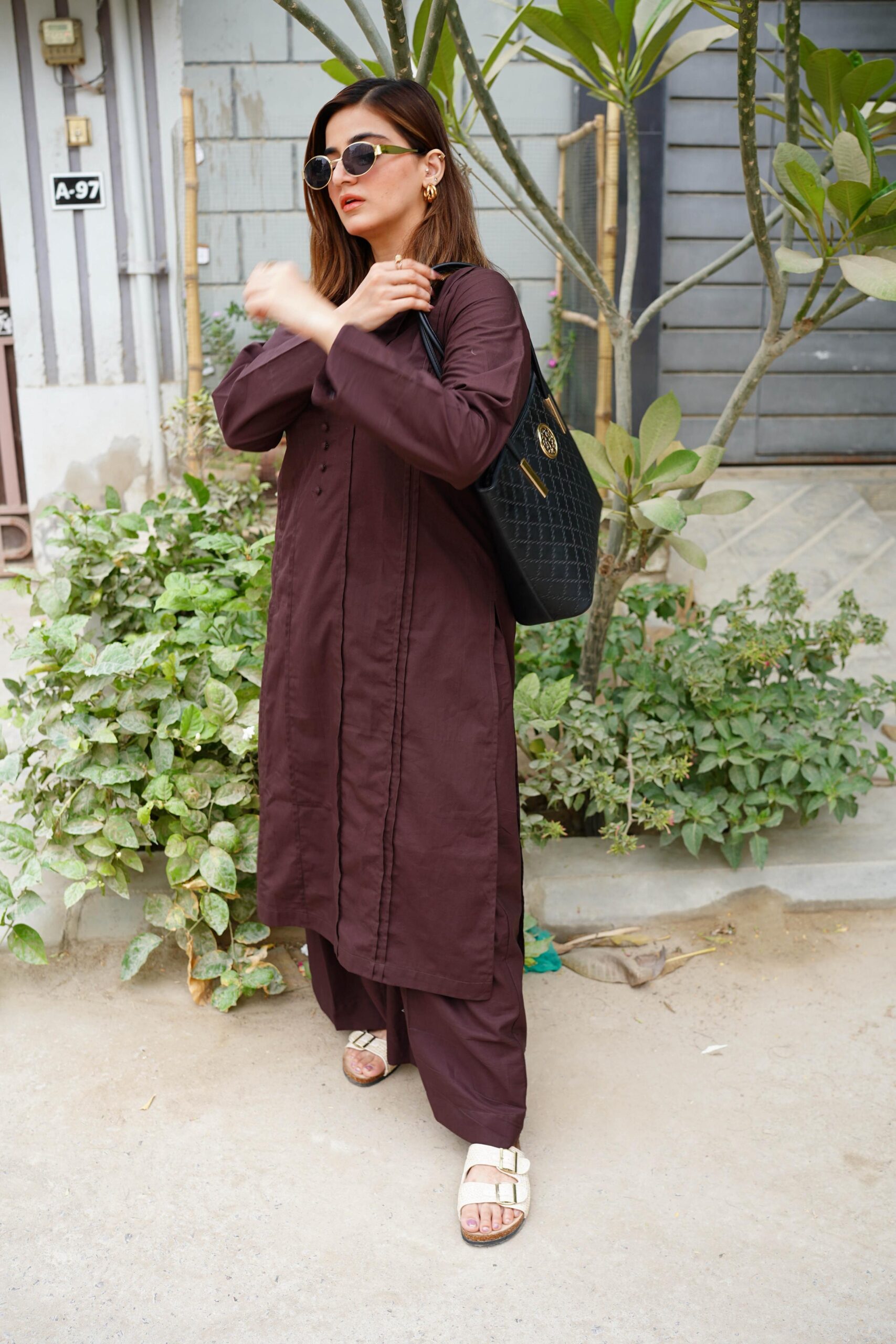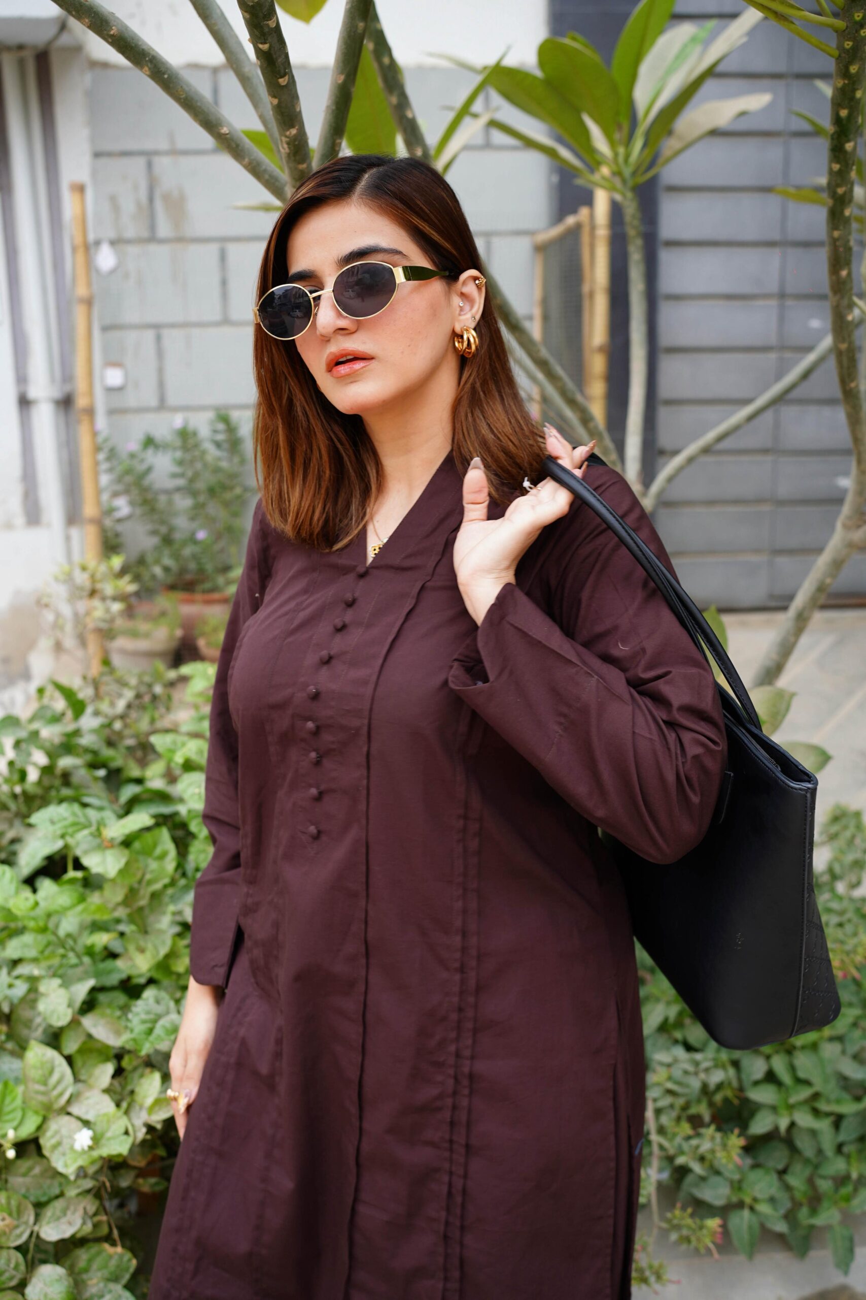 A deep chocolate brown long shirt featuring minimal pintuck detailing and a sleek straight cut, paired with wide-legged trousers for an effortlessly chic look. Perfect for everyday wear, this design balances comfort with understated elegance.