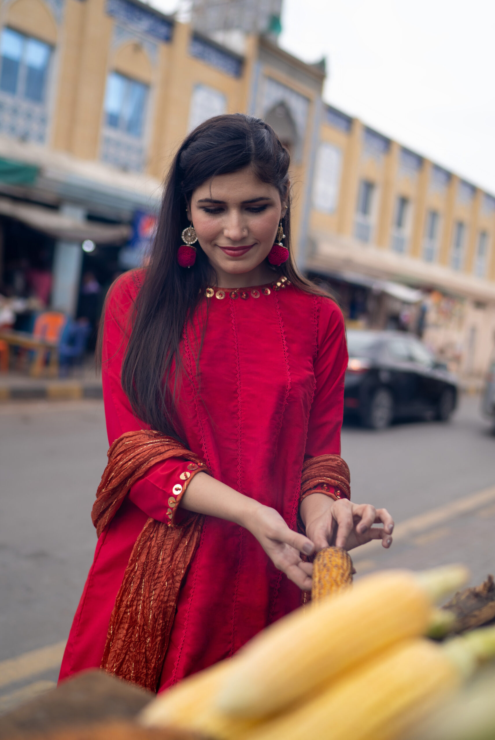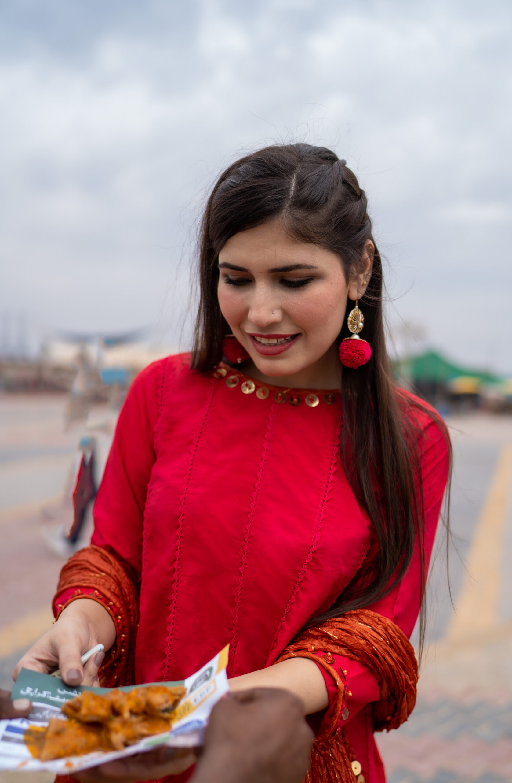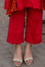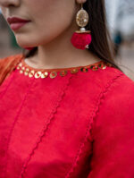 Captivate hearts with Roop Tera Mastana. This paneled scarlet red frock, detailed with delicate lace, is paired with a matching flapper and a contrasting dupatta adorned with minimal gold sequins. A timeless design that blends elegance with allure.