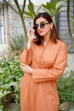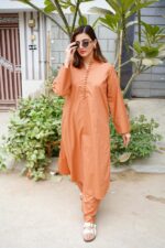 Bask in understated elegance with this light rust outfit, designed in a straight-cut silhouette for a timeless appeal. Featuring minimal detailing and paired with matching bottom, it’s the perfect blend of comfort and style.